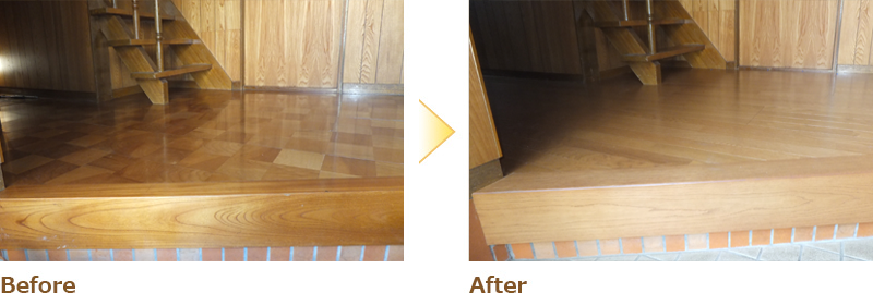 長年使われたフローリング面材が肌別れをおこしていたので部分的に補修、なおかつよく歩く箇所は床下からも補修をしました。既存の床の上から2重貼りに仕上げることによりコストの低減につながりました。また、新しいフローリングは明るい色にしたので温かみのある明るい玄関になりました。