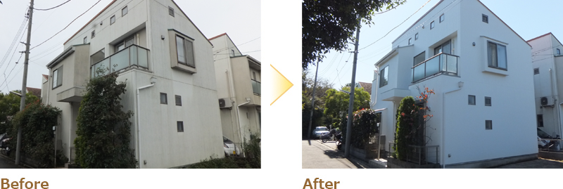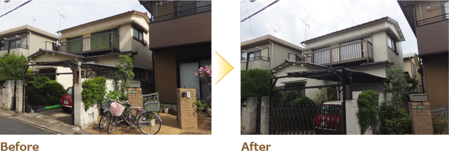 長年の屋根、外壁の汚れを丁寧に高圧洗浄で洗い流し、サイディングの目地もコーキングを打ちなおしました。 鉄部、木部も塗装をして新築の時の輝きを取り戻しました。また、お庭と垣根を剪定することで、すっきりして採光もよくなりました。