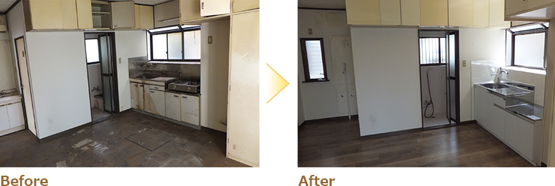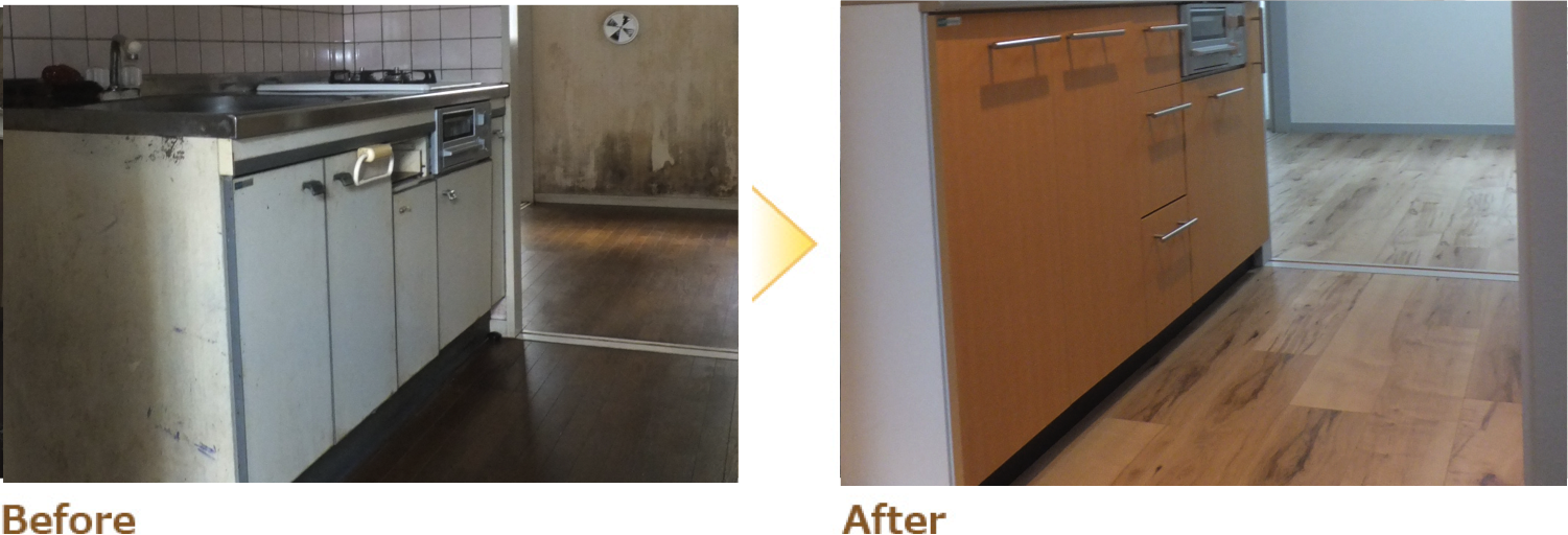 借主が退去された部屋です。今回は傷んだキッチン交換とフローリング張り替えを行いました。大家さんも一安心。喜んで頂きました。