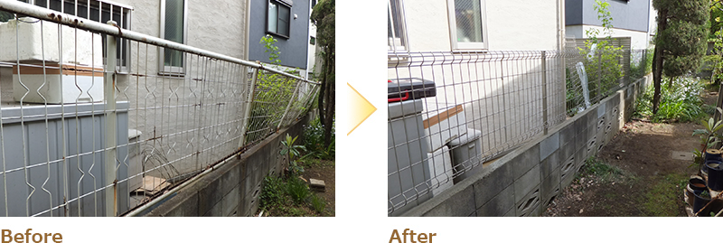 錆びて折れてしまったスチール製のフェンスを交換いたしました。色味は変わってしまいますが、部分的にブロックを差し替えることで費用の削減をし、アルミ製の支柱を使い錆びも出ず長くご使用頂けると思います。