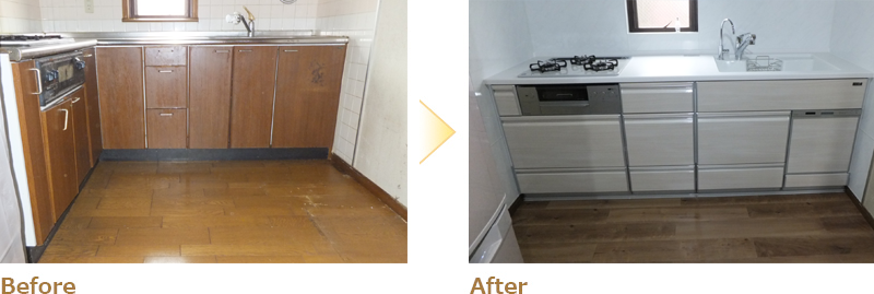 L型のキッチンをストレート型のキッチンに入れ替えました。以前の木目家具調からホーロー製のキャビネットにされたことによって上品な艶と明るさが生まれました。選んだキッチンカラーに合わせて床も選んで頂き、とてもお客様のセンスが輝いた仕上がりになっております。