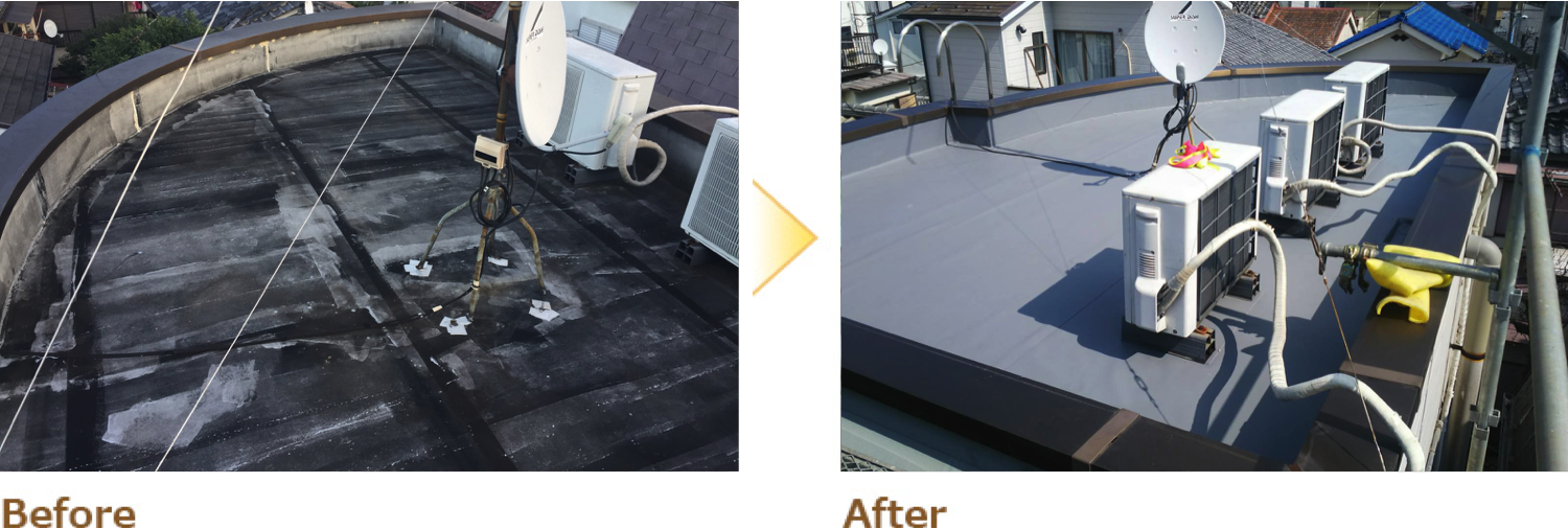 鉄骨造住宅の屋上防水改修工事です。今回、お客様の希望で断熱シート防水工法を施しています。