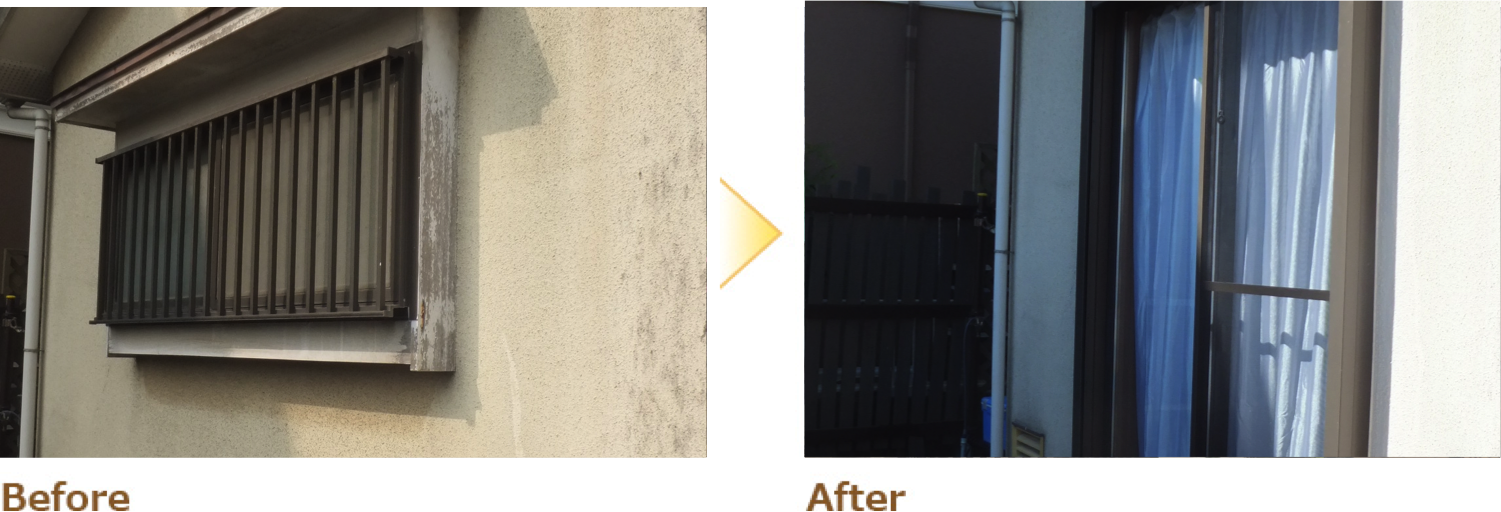 出窓を掃出し窓に交換しました。採光性と風通しが向上。防犯上シャッター付きに致しました。