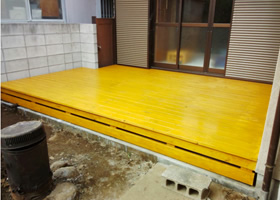 長年使われたフローリング面材が肌別れをおこしていたので部分的に補修、なおかつよく歩く箇所は床下からも補修をしました。既存の床の上から2重貼りに仕上げることによりコストの低減につながりました。また、新しいフローリングは明るい色にしたので温かみのある明るい玄関になりました。