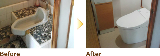 和式のトイレを洋式のトイレに取り替えさせて頂きました。トイレの壁紙の変更も同時に行ってとても奇麗な新しいトイレに生まれ変わりました。